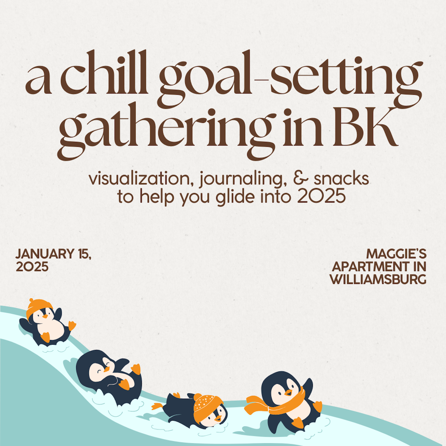 Ready to hit the ground running in the new year? Whether you’ve already started thinking about your goals or need a cozy, supportive space to jot them down, come join me for a fun goal-setting gathering at my Williamsburg apartment!