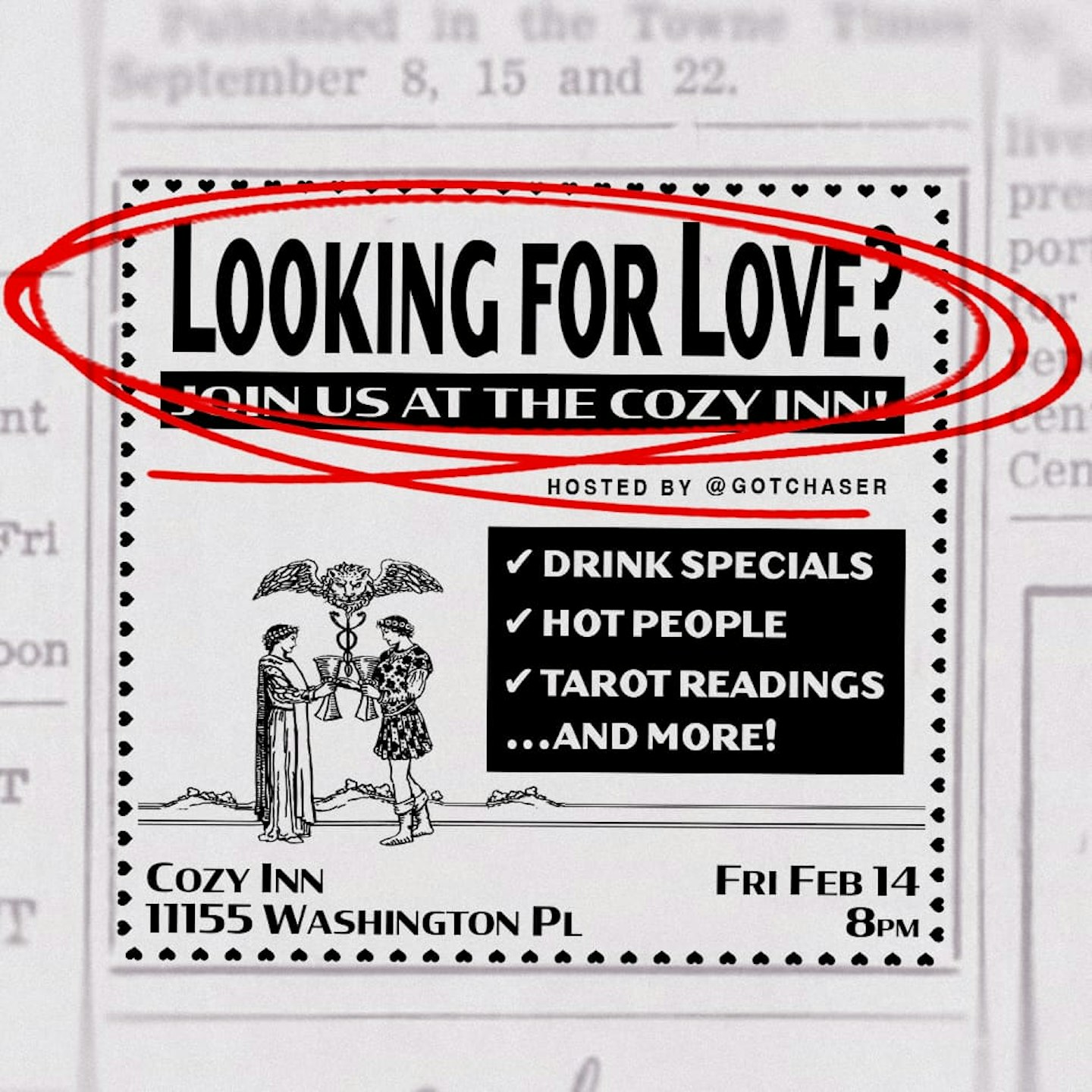 We’ll have a tarot card reader doing love readings from 8-10:30 PM (first come, first served) along with themed drinks and cool people. Oh and the bar has a jukebox, darts and pool tables (a proper dive bar!) So shoot your shot with a cutie at the bar or just take a shot (tequila’s our fave) and let’s have a night!