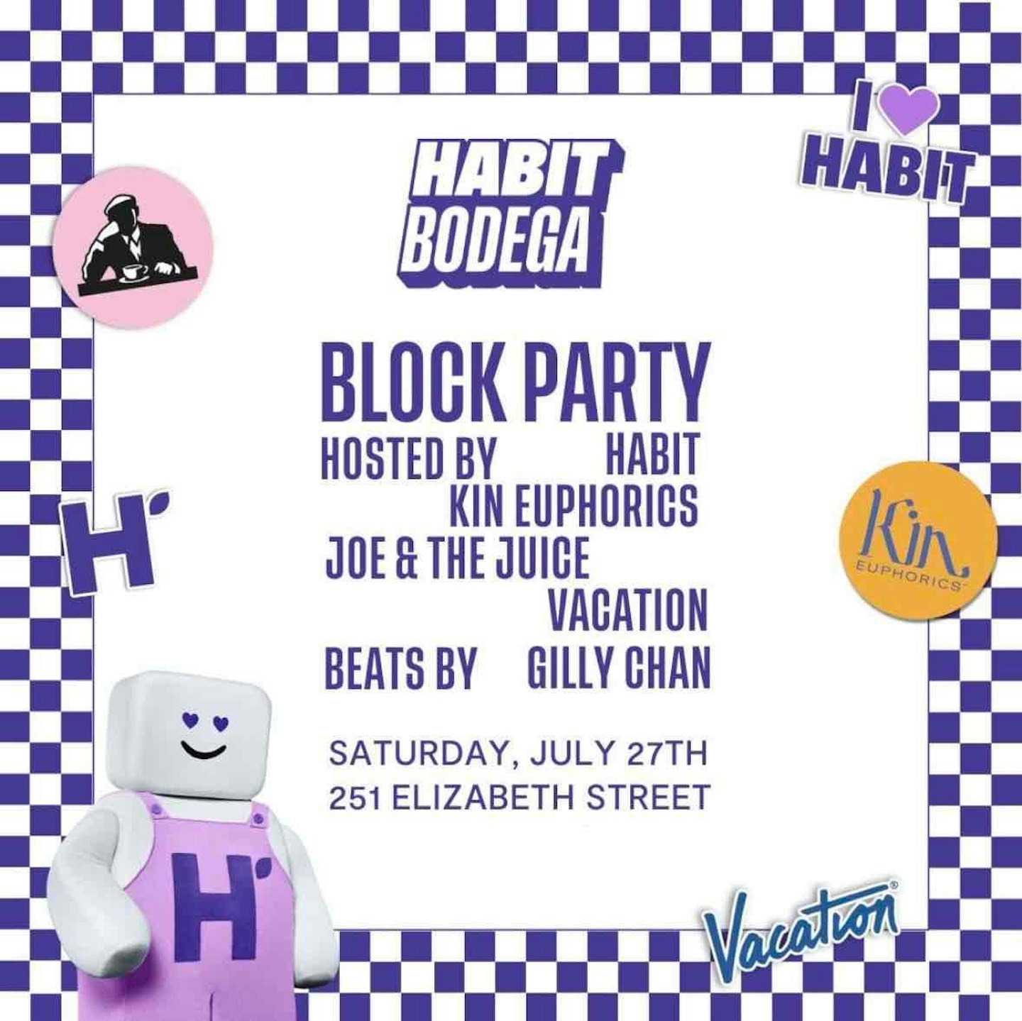 BODEGA BLOCK PARTY! Join us on Saturday, July 27th for a day with HABIT & friends, featuring Joe & The Juice, Kin Euphorics and Vacation. Hang wtih Habit mascot HABBIE. Beats by DJ Gilly Chan. xx @habitsupps